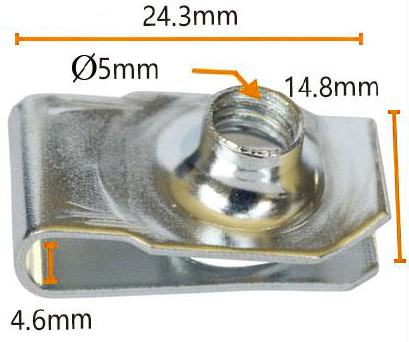 Die bevestiging spog met presiese algehele afmetings, wat 24,3 mm in breedte en 14,8 mm hoog is, wat 'n naatlose pas met bevestigingspunte op u motor verseker. Daarbenewens kan die lengte van 4,6 mm aan die onderkant van die beeld verwys na 'n kritiese dimensie van 'n spesifieke deel, wat die produk se professionaliteit en presisie verder beklemtoon.